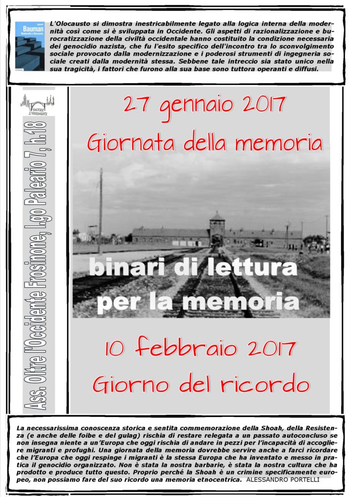 L’associazione Oltre l’Occidente ha già svolto nel 2016 due incontri ( memoria e ricordo 1,2,3). Si chiede se si vuole appunto replicare questa iniziativa invitando le associazioni ad aderire e i singoli a indicare una loro disponibilità e il testo da cui la lettura.