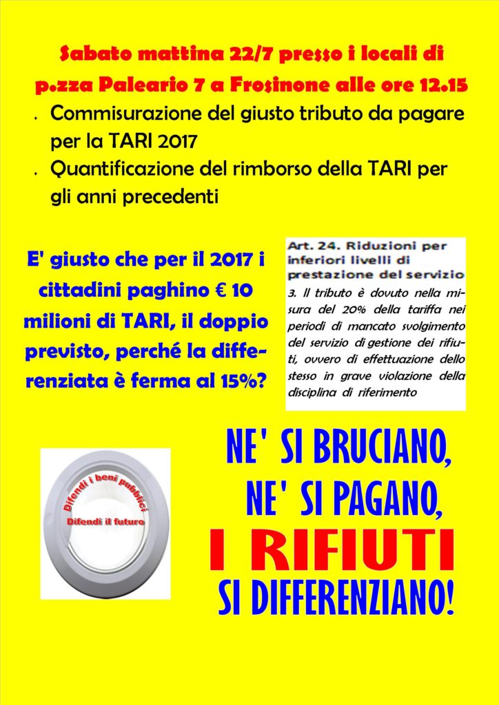 Campagna di NE’ SI BRUCIANO NE’ SI PAGANO, I RIFIUTI SI DIFFERENZIANO!, volta alla commisurazione del giusto tributo da pagare per la TARI 2017 e per la quantificazione del rimborso della TARI per gli anni precedenti alla luce della effettuazione del servizio di gestione dei rifiuti in grave violazione della disciplina di riferimento, come previsto dall’articolo 24 e dall’art.13 del Regolamento per l’applicazione della tassa sui rifiuti Tari.