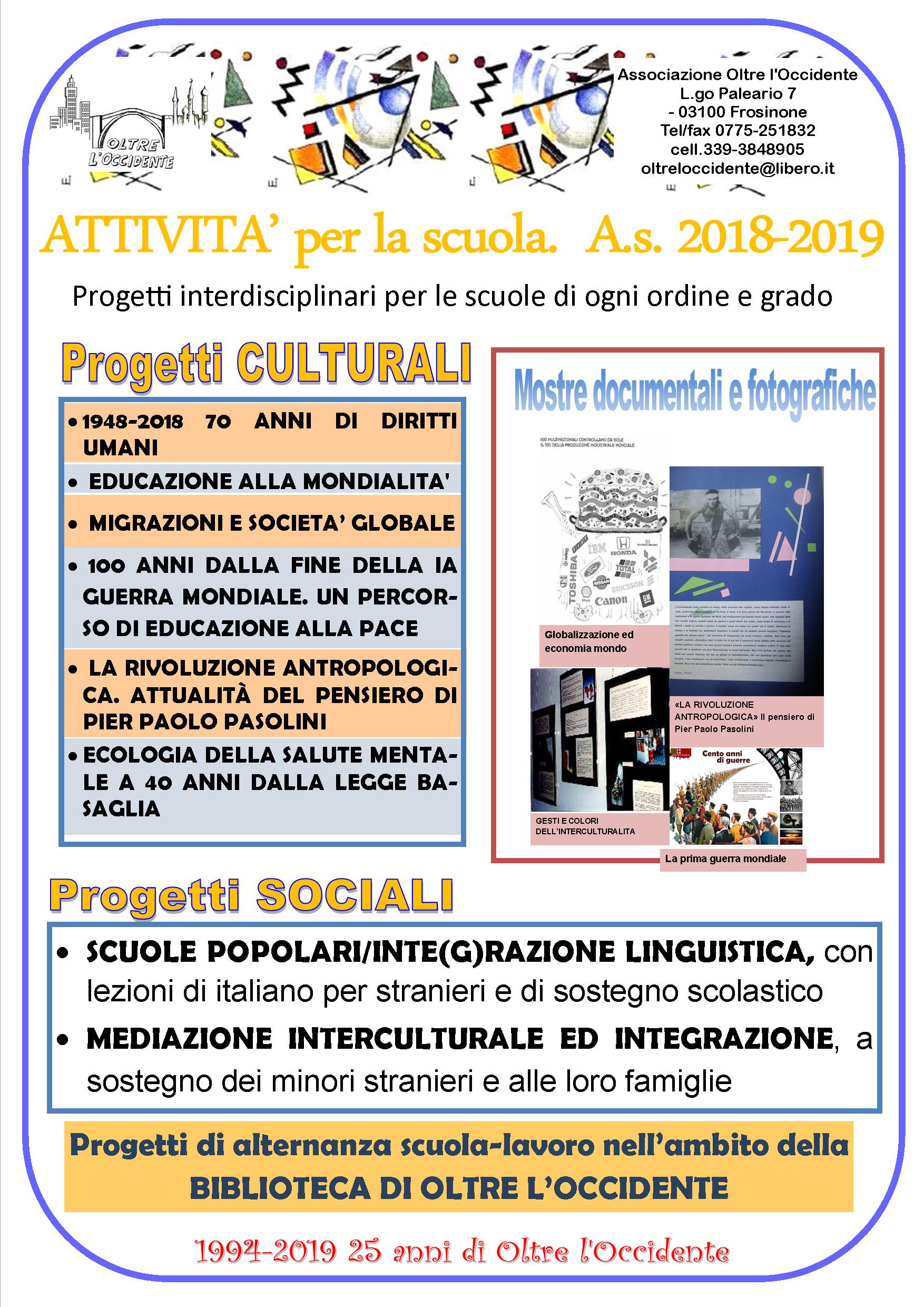 L’associazione Oltre l’Occidente, allo scopo di interagire con i giovani, porta avanti una serie di progetti nelle scuole da oramai venti anni. Finalità ultima dei progetti è quella di favorire l’approfondimento di tematiche educative e sociali per contribuire alla formazione di una cultura civica e solidale.