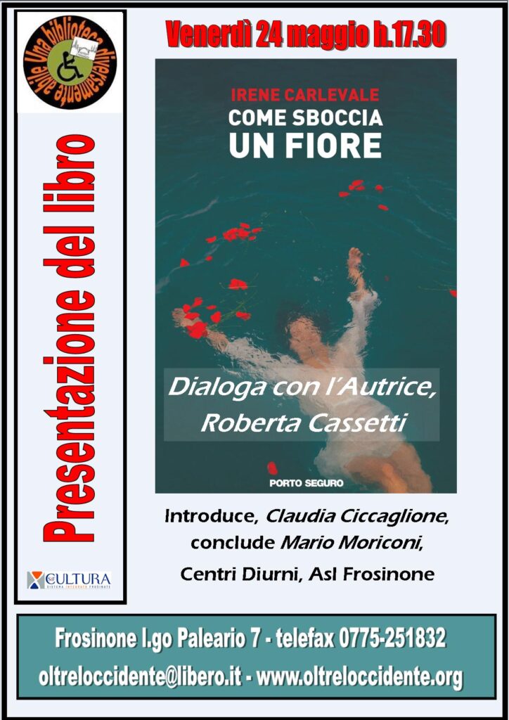 Il 24 maggio presso la sede di Oltre l’Occidente Irene Carlevale, (Frosinone, 1982), eclettica scrittrice. presenta il proprio libro “Come sboccia un fiore”. Introduce Claudia CIccaglione, dialoga con l’Autrice Roberta Cassetti, conclude Mario Moriconi, responsabile centri diurni ASL Frosinone