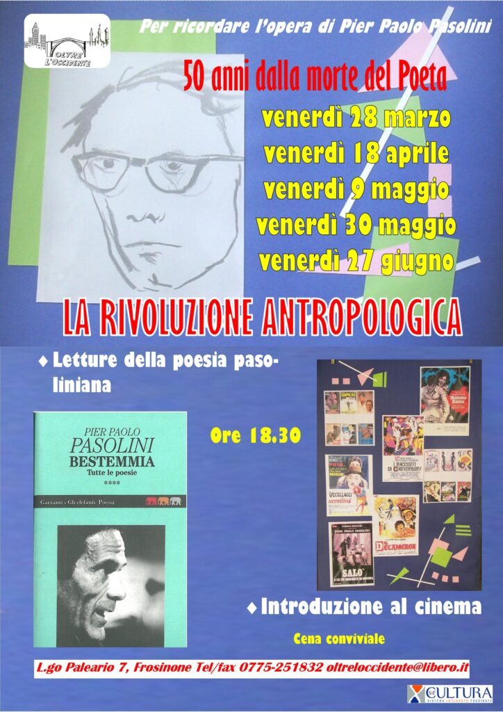 A 50 anni dalla morte del Poeta, l’Associazione propone analisi, approfondimenti, letture, visioni, riflessioni sull’opera di Pier Paolo Pasolini.