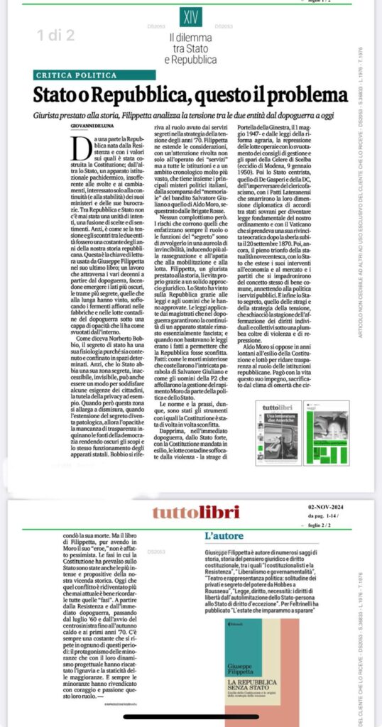 La pubblicazione nel 2024 di Giuseppe Filippetta del testo , La repubblica senza stato, L’esilio della Costituzione e le origini della strategia della tensione per Feltrinelli che ricostruisce la storia italiana dalla Costituente in poi attraverso il contrappunto tra principi costituzionali elaborati con forte impronta dossettiana, azionista e socialcomunista e l’apparato statale che dovrebbe metterli in opera, ha destato interesse per l’Associazione scrivente anche in quanto Giuseppe è nato a Frosinone dove ha frequentato tutte le scuole di ogni ordine e grado e vissuto anche come sportivo la città.