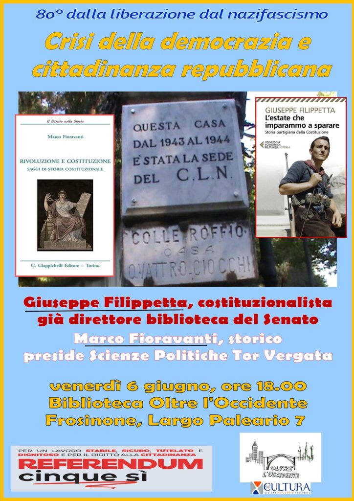 Intervengono Giuseppe Filippetta, frusinate doc, nato a Frosinone nel 1962 e frequentante tutte le scuole di ogni ordine e grado in città, già Direttore della Biblioteca ‘Giovanni Spadolini’ del Senato della Repubblica e dell’Archivio storico del Senato della Repubblica, autore di numerosi saggi di storia, storia del pensiero giuridico e diritto costituzionale, tra i quali I costituzionalisti e la Resistenza (2018), L’estate che imparammo a sparare. Storia partigiana della Costituzione (2018), e ultimo La repubblica senza stato, L’esilio della Costituzione e le origini della strategia della tensione, ultimi due pubblicati con la casa editrice Feltrinelli; e Marco Fioravanti professore ordinario in Storia del Diritto medievale e moderno nell’Università degli Studi di Roma “Tor Vergata”, Dipartimento di Giurisprudenza, il cui ultimo libro è Rivoluzione e Costituzione. Saggi di Storia costituzionale, Prefazione di Pietro Costa, Torino, Giappichellli, 2022.