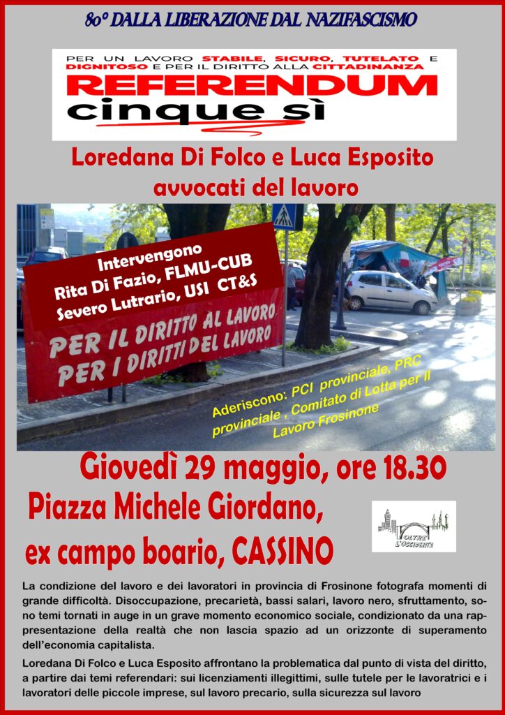 29 maggio, Per il diritto al lavoro, per i diritti del lavoro. Intervengono Loredana DI Folco e Luca Esposito, mentre per la CUB Rita Di Fazio e per l’USI Severo Lutraio, ex campo boario, Cassino ore 18.30