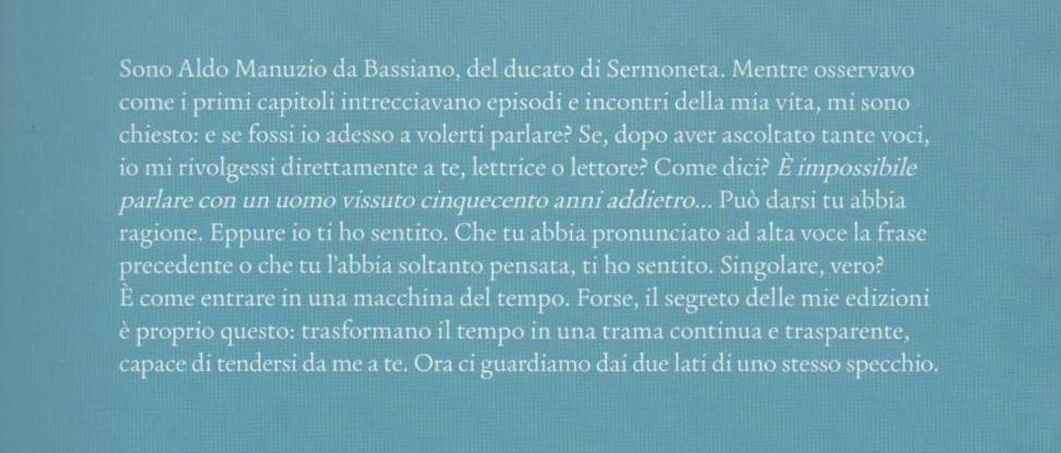 Aldo Manuzio Una biografia sognata è un libro in cui si incontrano l’amore per i libri del suo autore e la ricerca sul protagonista. Scritto come pochi autori italiani contemporanei ormai fanno, è destinato a chiunque ami i libri. È un testo leggero che racchiude in sé una parte della storia della stampa dei libri in Italia.