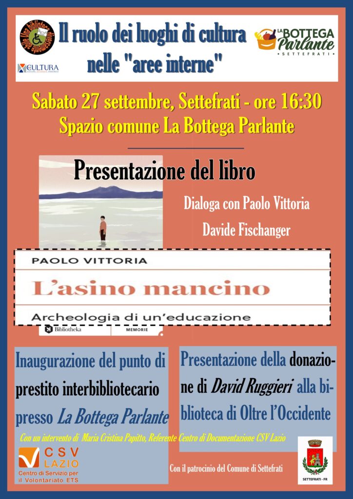 Nel corso del pomeriggio vi sarà la presentazione del libro L’Asino Mancino. Archeologia di una educazione di Paolo Vittoria che dialoga con Davide Fischanger, operatore culturale che ha anche curato uno studio su Mario Lodi. A seguire inaugurazione del punto di prestito interbibliotecario presso La Bottega Parlante e la presentazione della donazione di David Ruggieri alla biblioteca di Oltre l’Occidente.